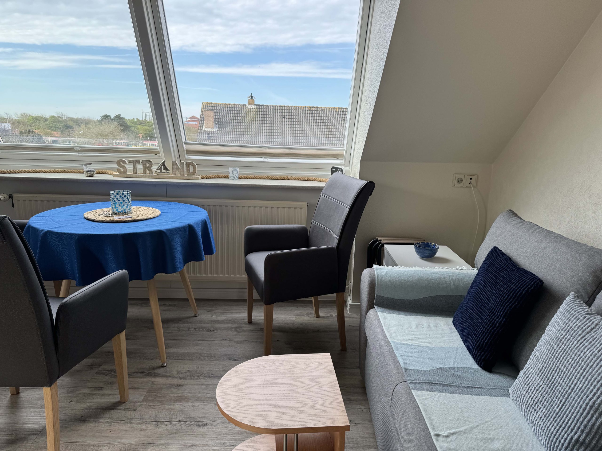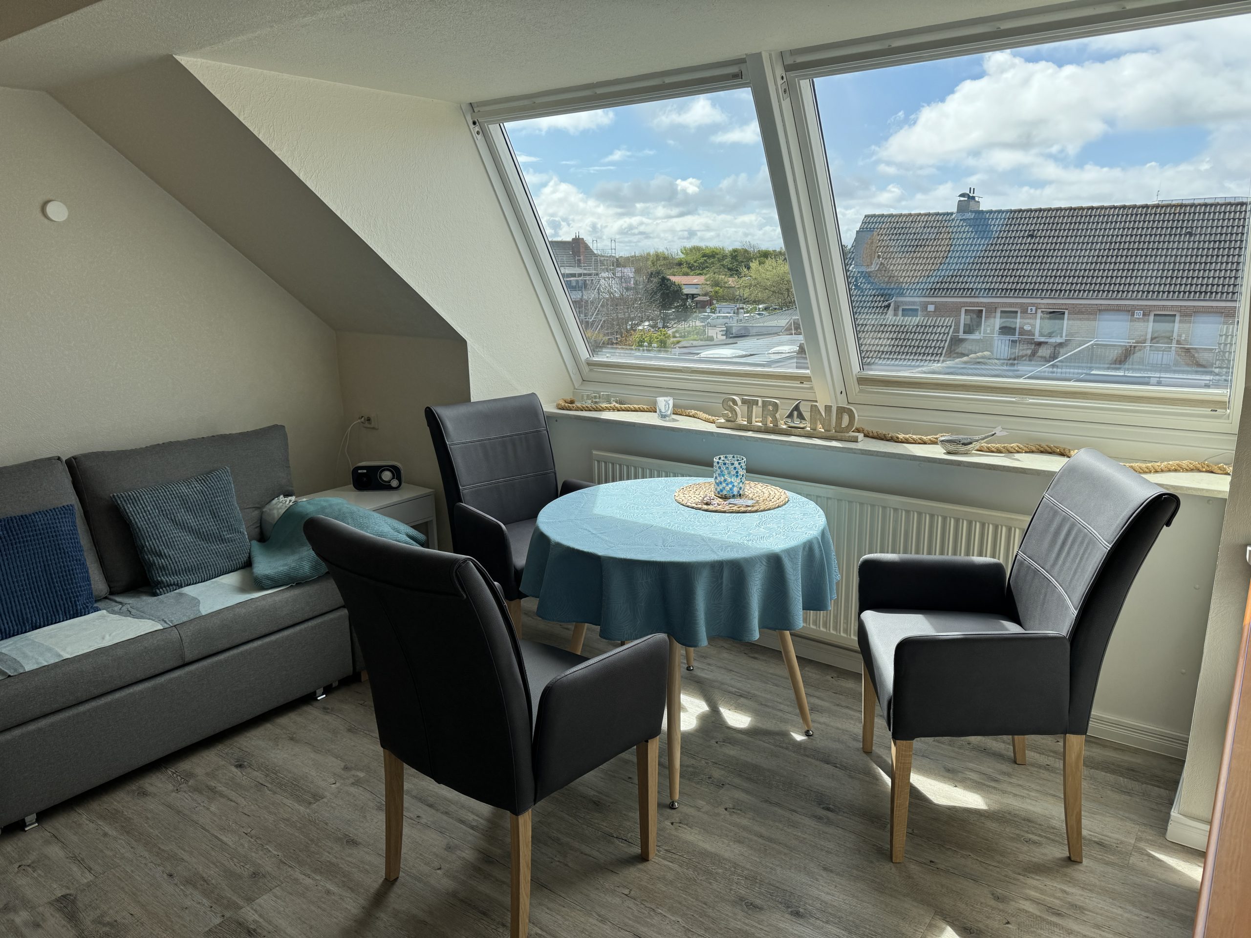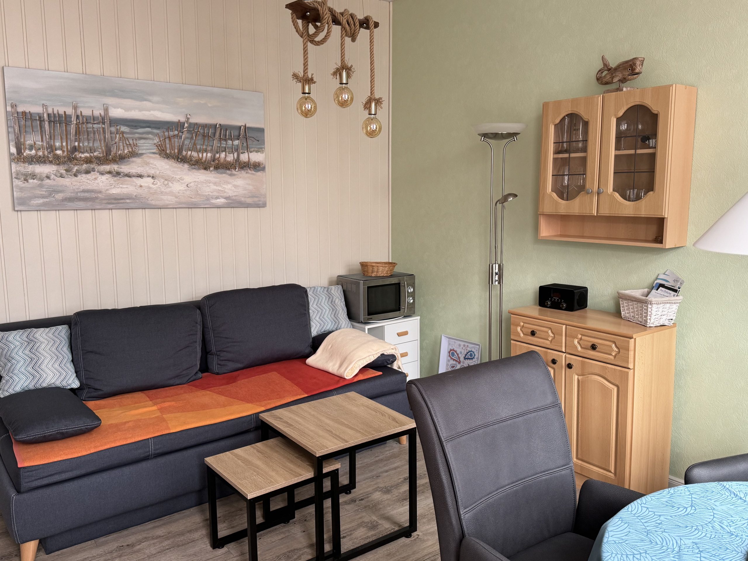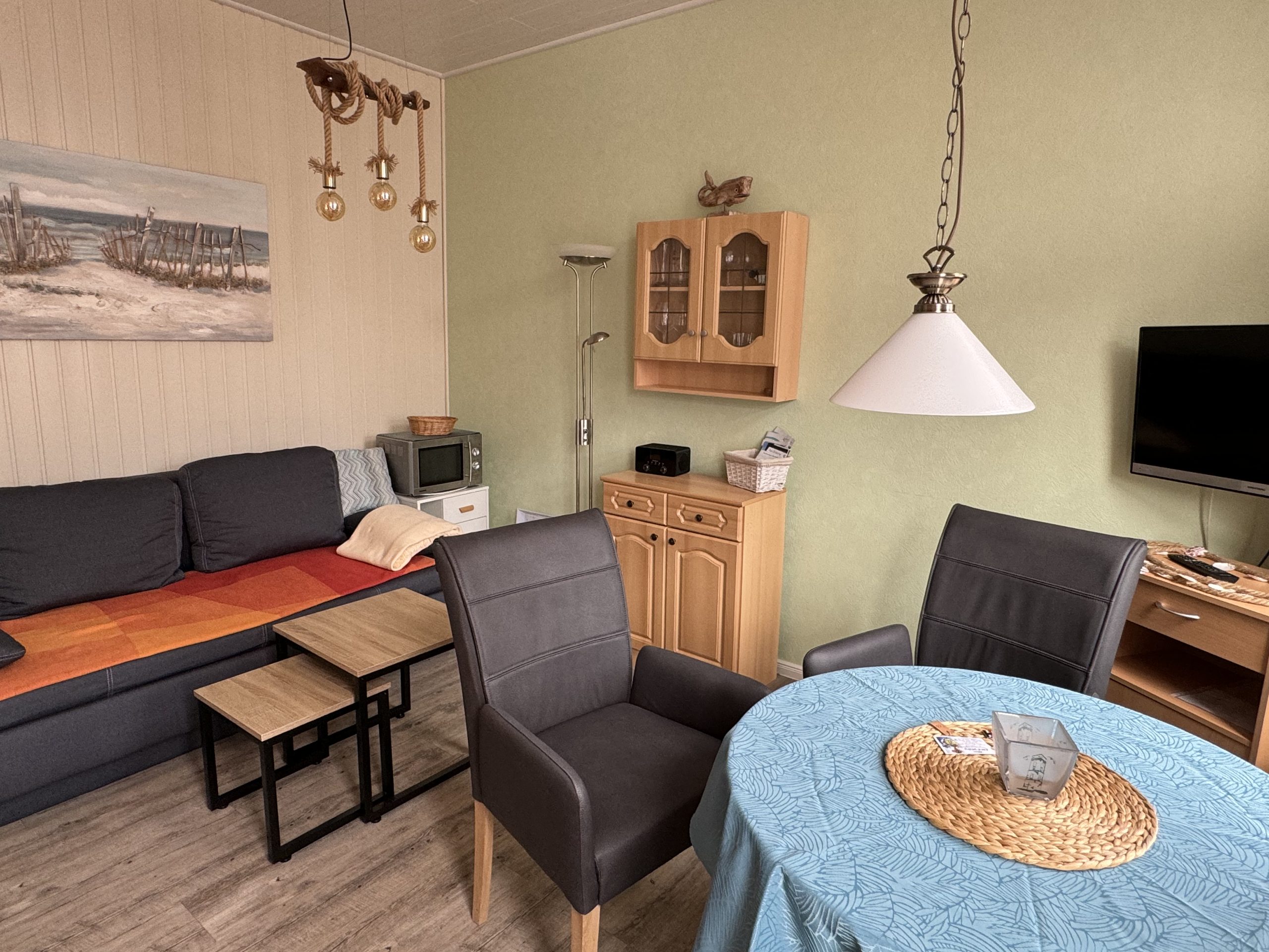 - Das Wohn-Esszimmer (14 qm) verfügt über eine gut ausgestattete Küchenzeile mit Induktionsherd, Airfryer, Kaffeemaschine, Wasserkocher, Toaster und Mixer; Sat-TV, einem runden Tisch mit bequemen Esszimmer-Stühlen sowie einem Sofa mit Schlaffunktion.