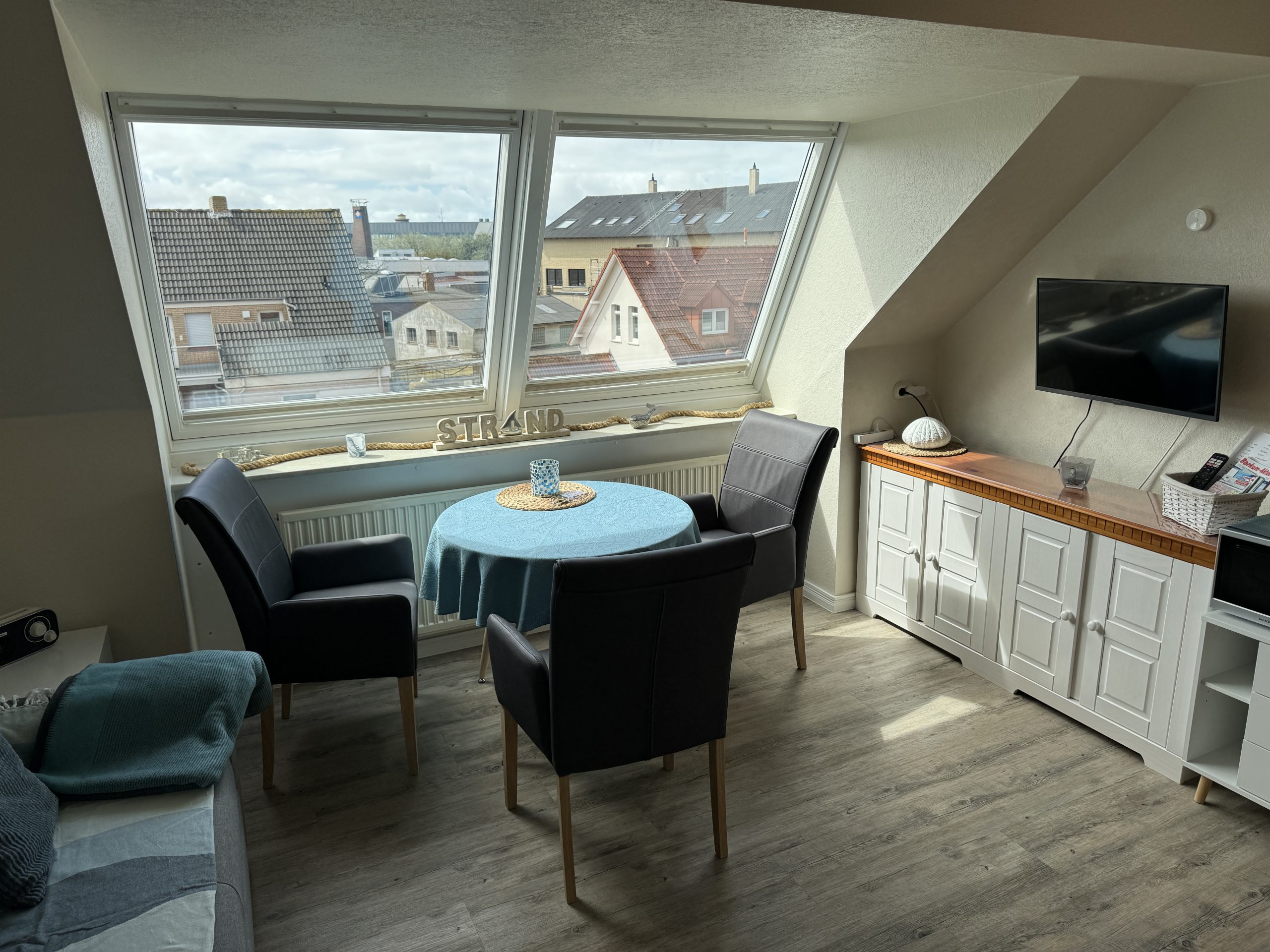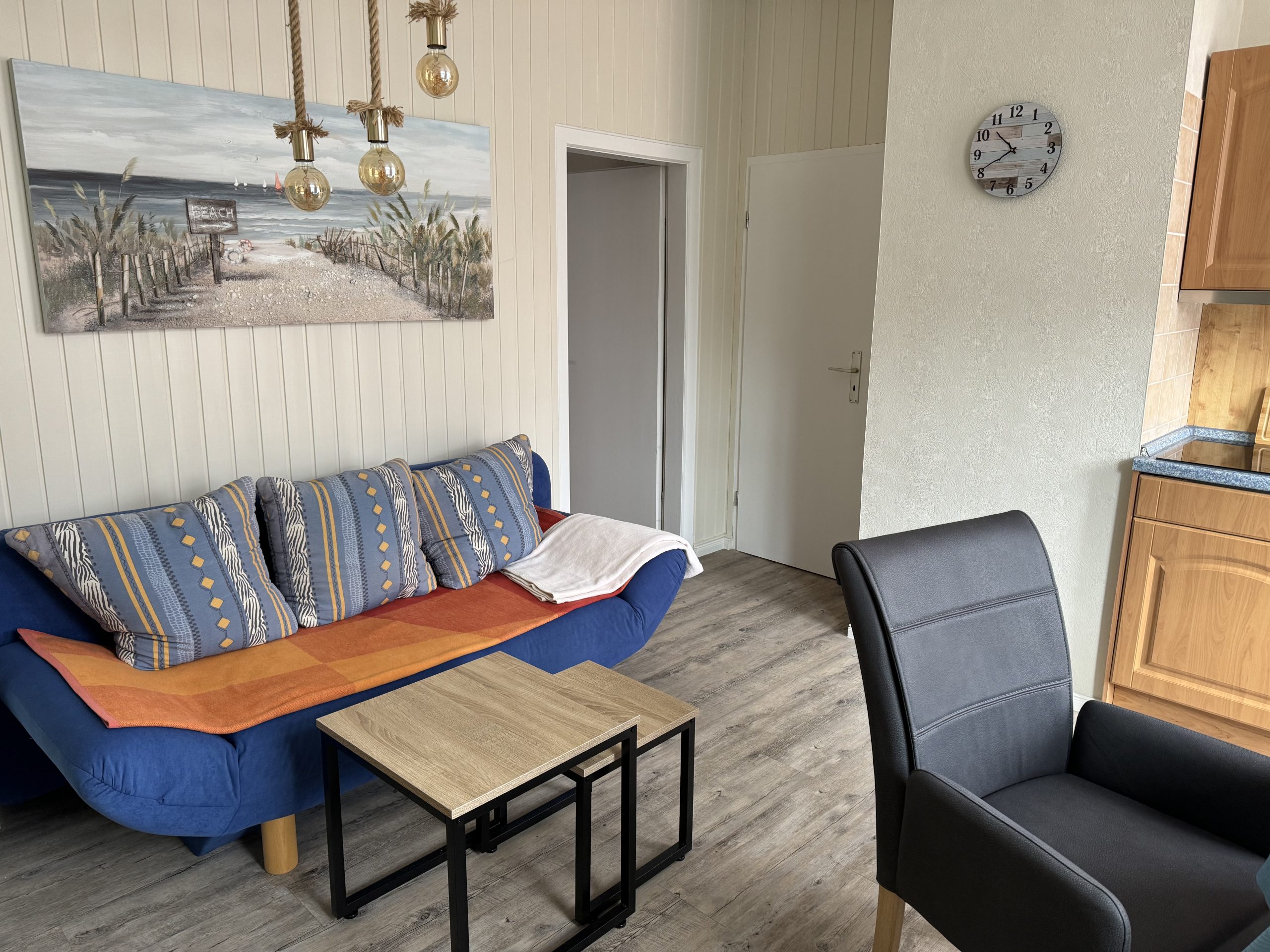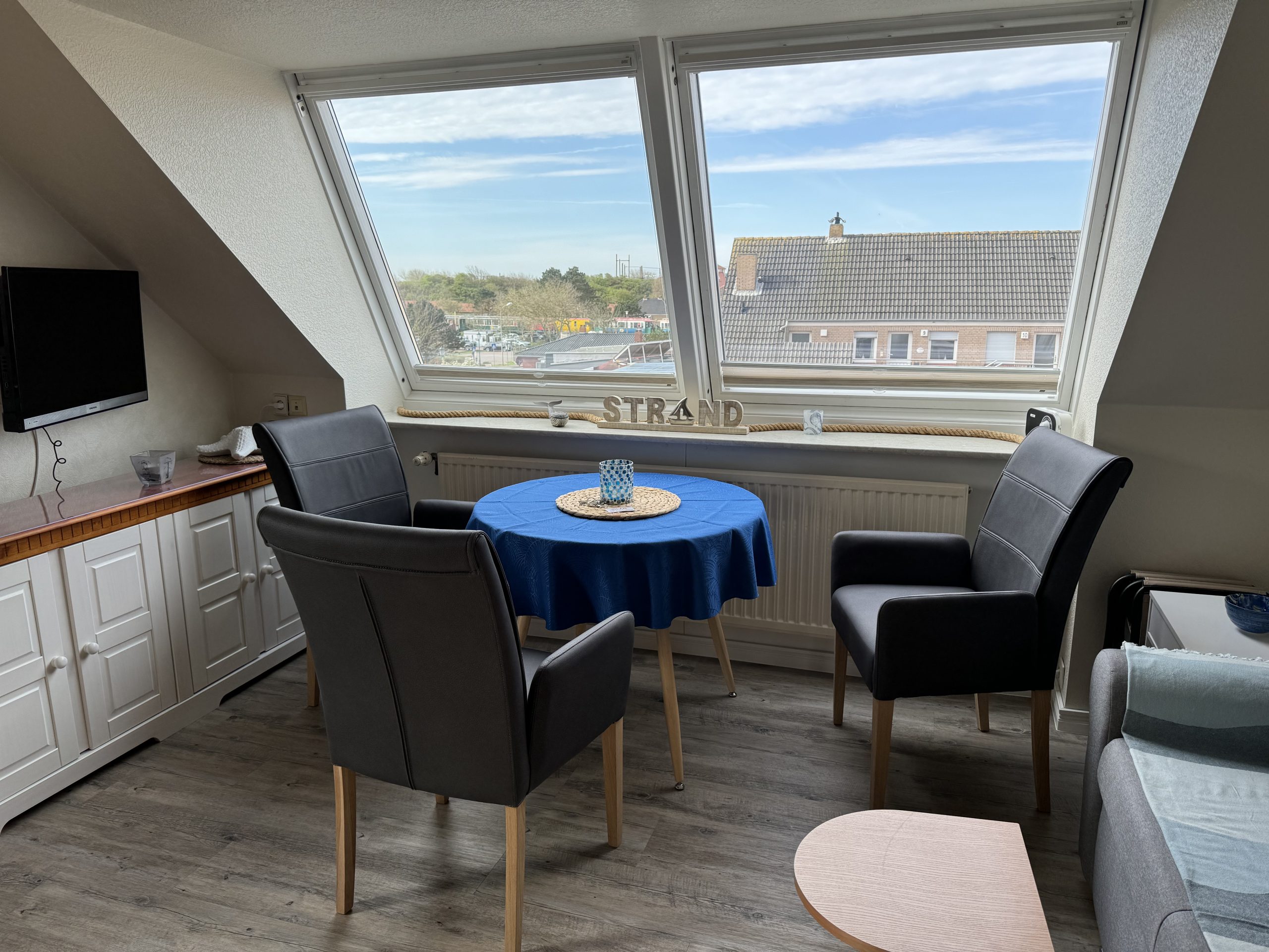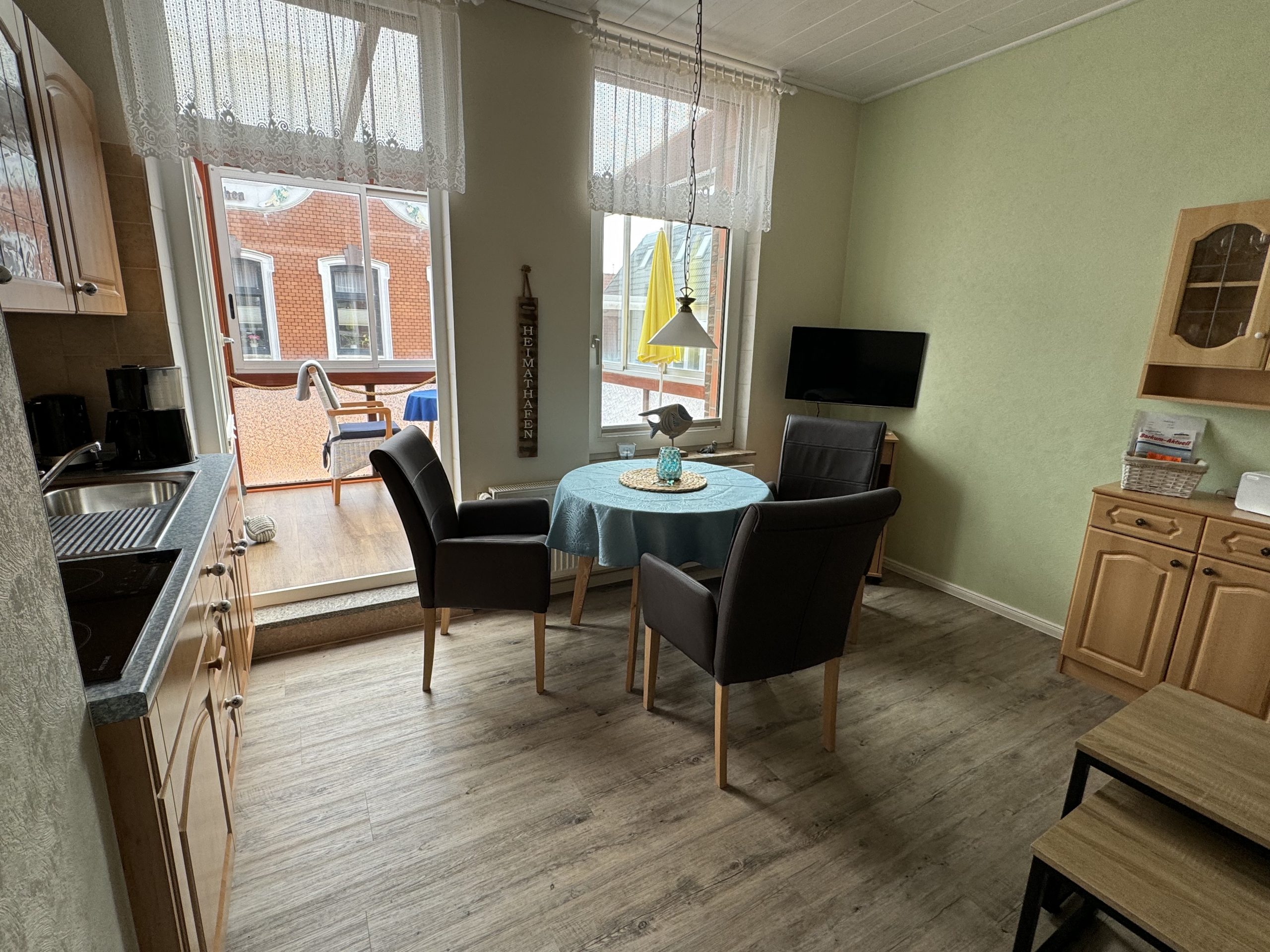 - Das Wohn-Esszimmer (14 qm) verfügt über eine gut ausgestattete Küchenzeile mit Induktionsherd, Airfryer, Kaffeemaschine, Wasserkocher, Toaster und Mixer; Sat-TV, einem runden Tisch mit bequemen Esszimmer-Stühlen sowie einem Sofa mit Schlaffunktion.