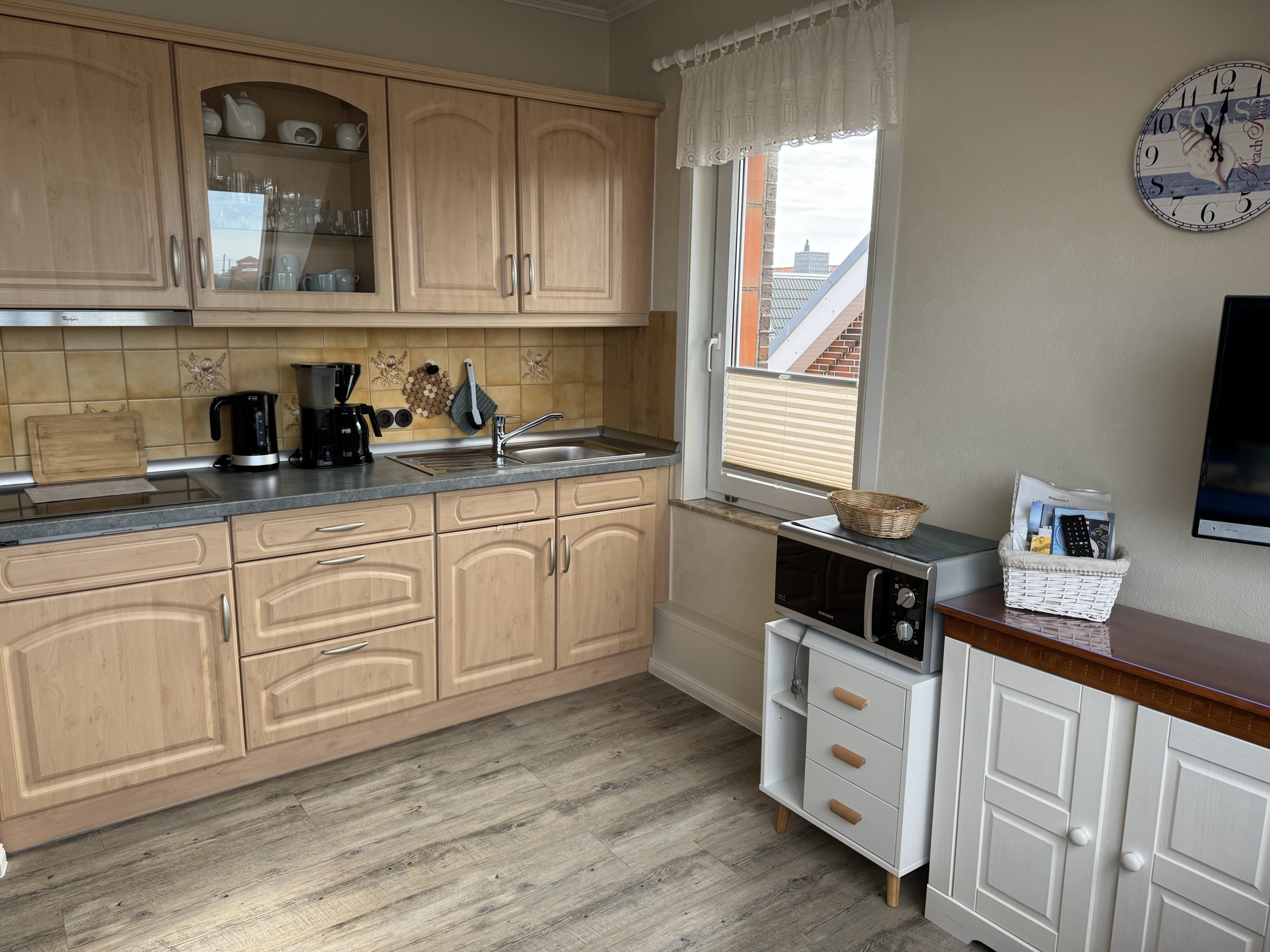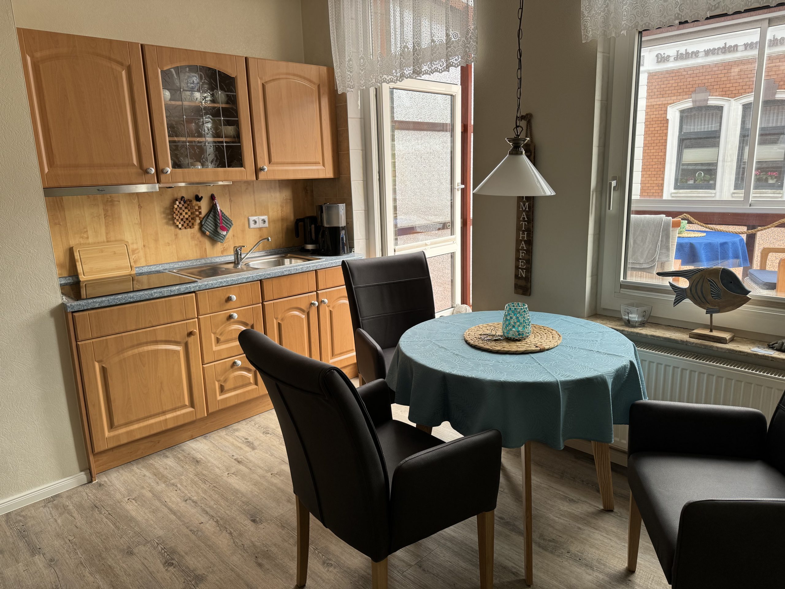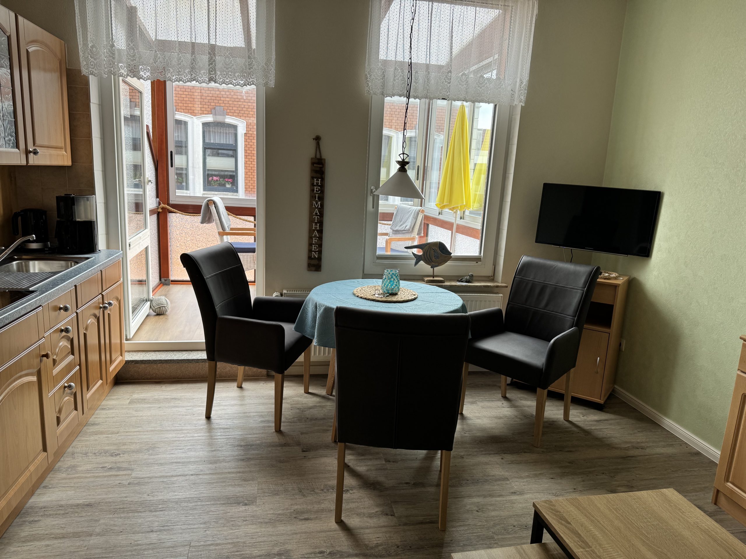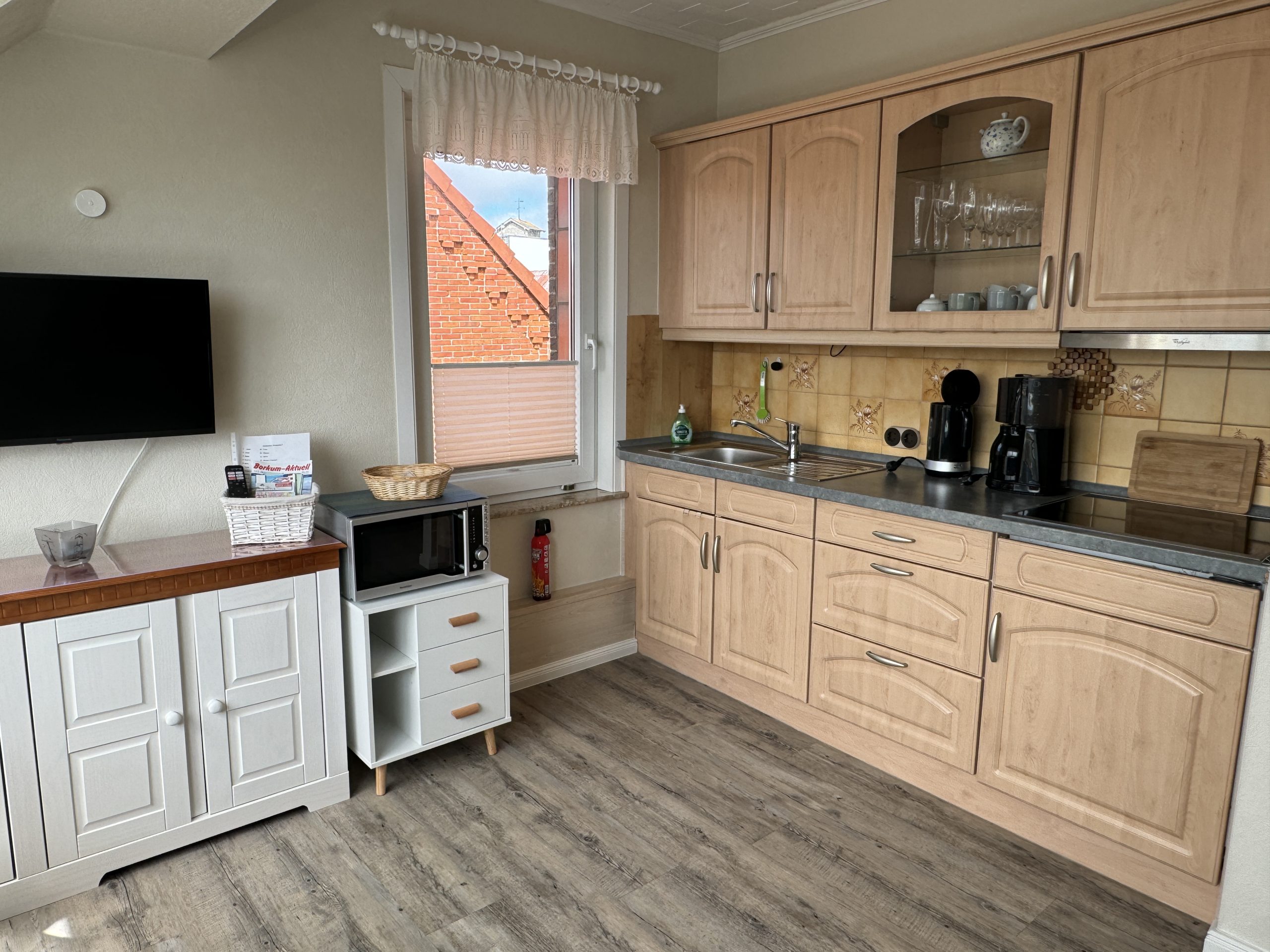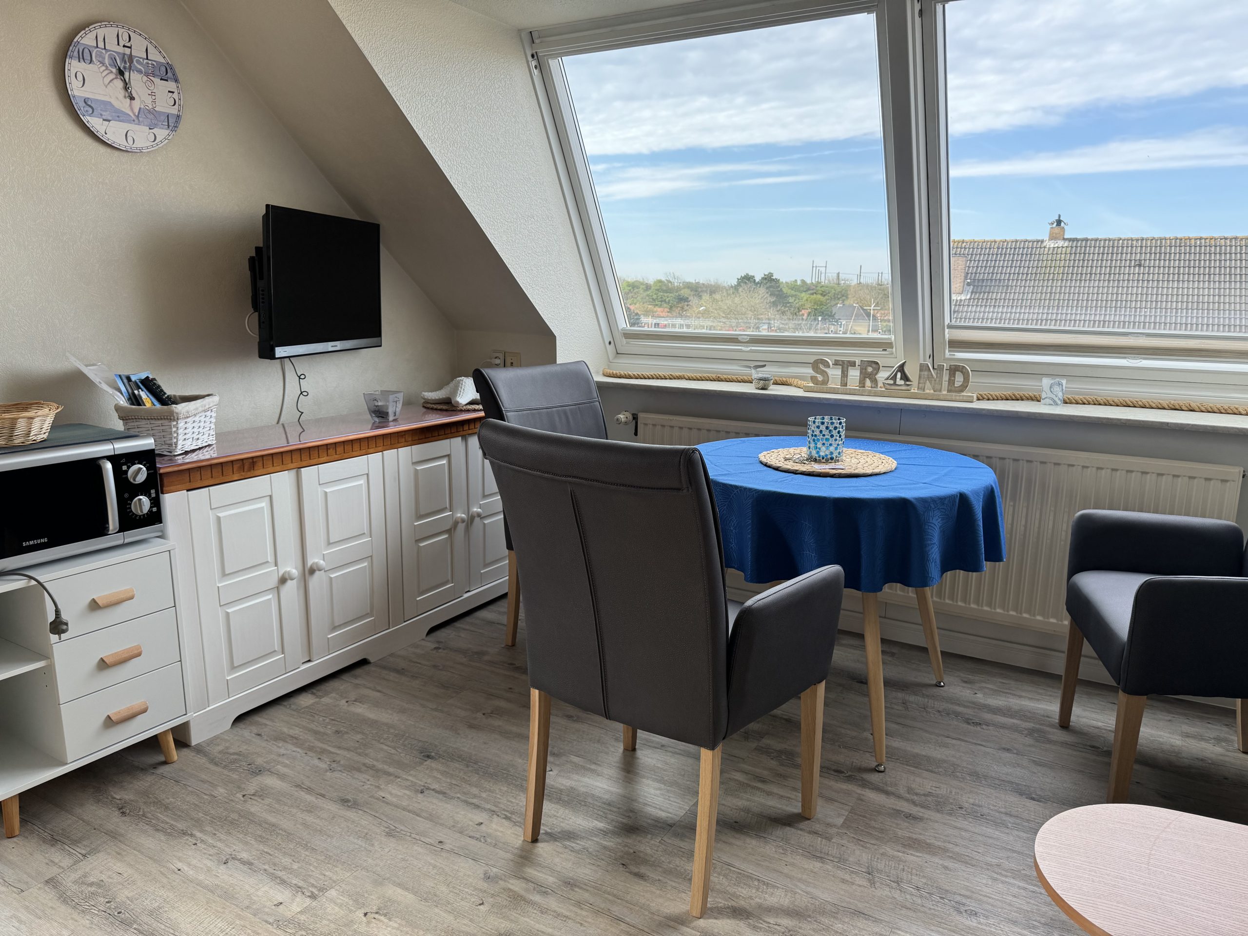 - Das Wohn-Esszimmer (14 qm) verfügt über eine gut ausgestattete Küchenzeile mit Induktionsherd, Airfryer, Kaffeemaschine, Wasserkocher, Toaster und Mixer; Sat-TV, einem runden Tisch mit bequemen Esszimmer-Stühlen sowie einem Sofa mit Schlaffunktion.