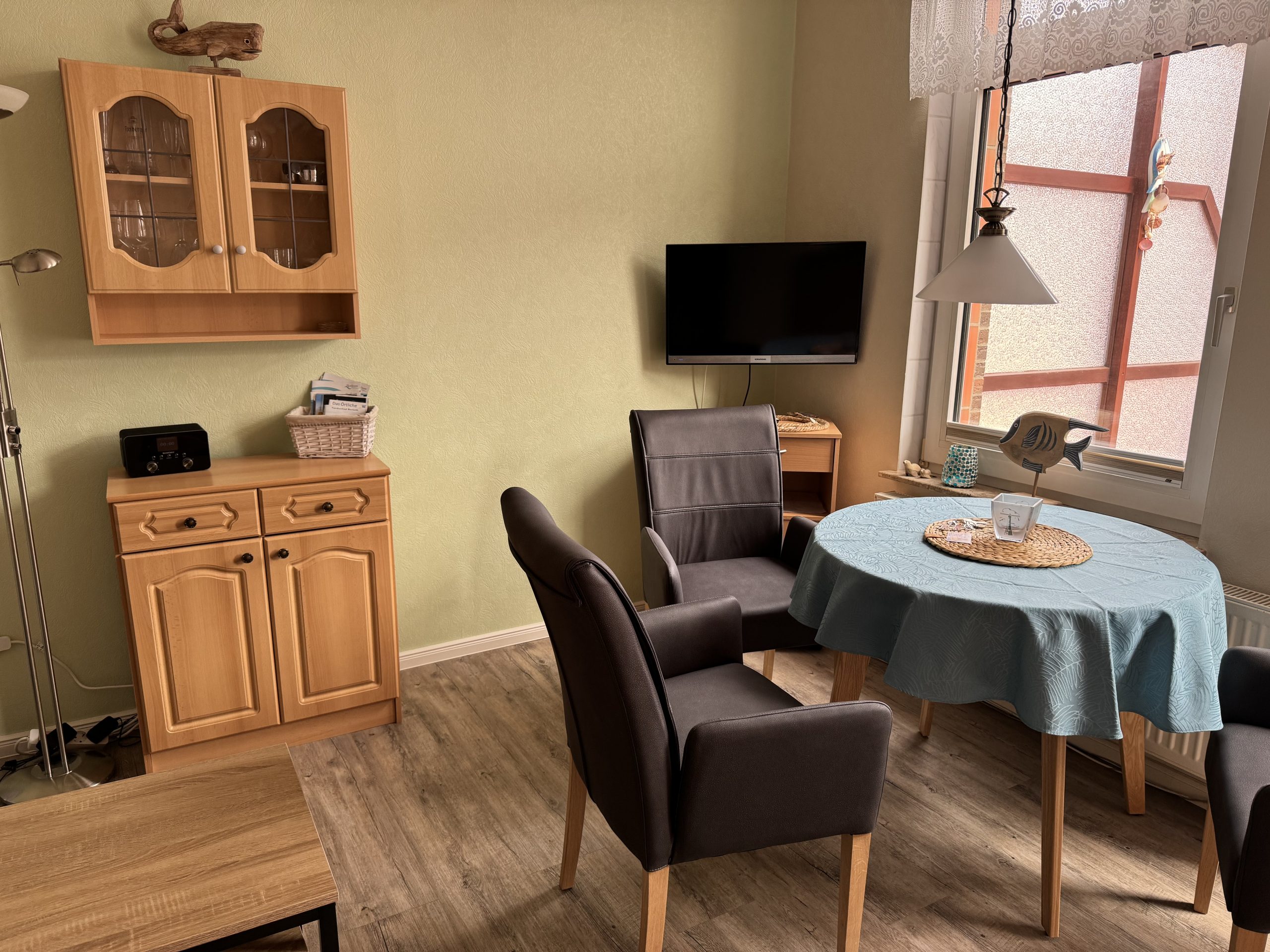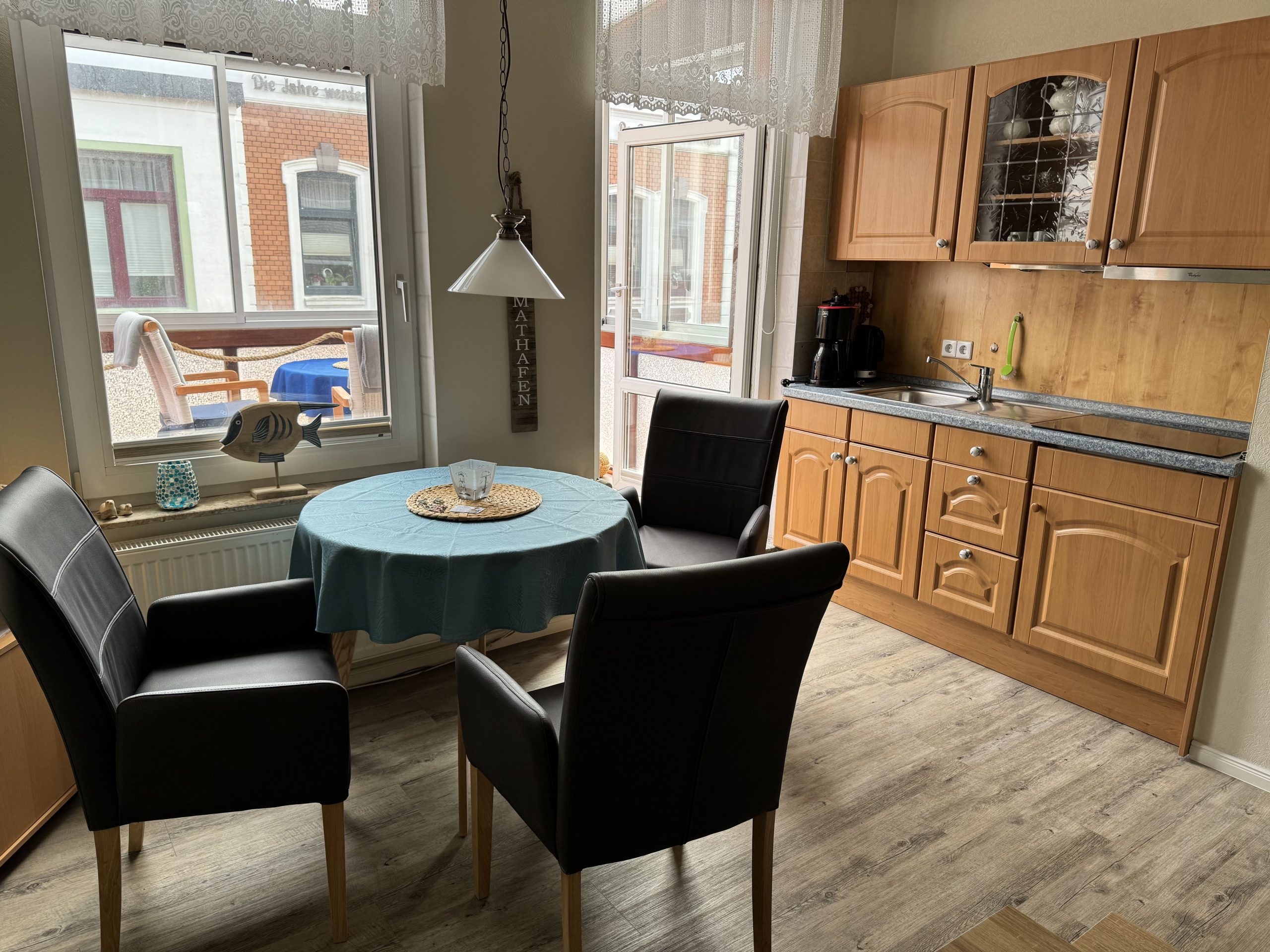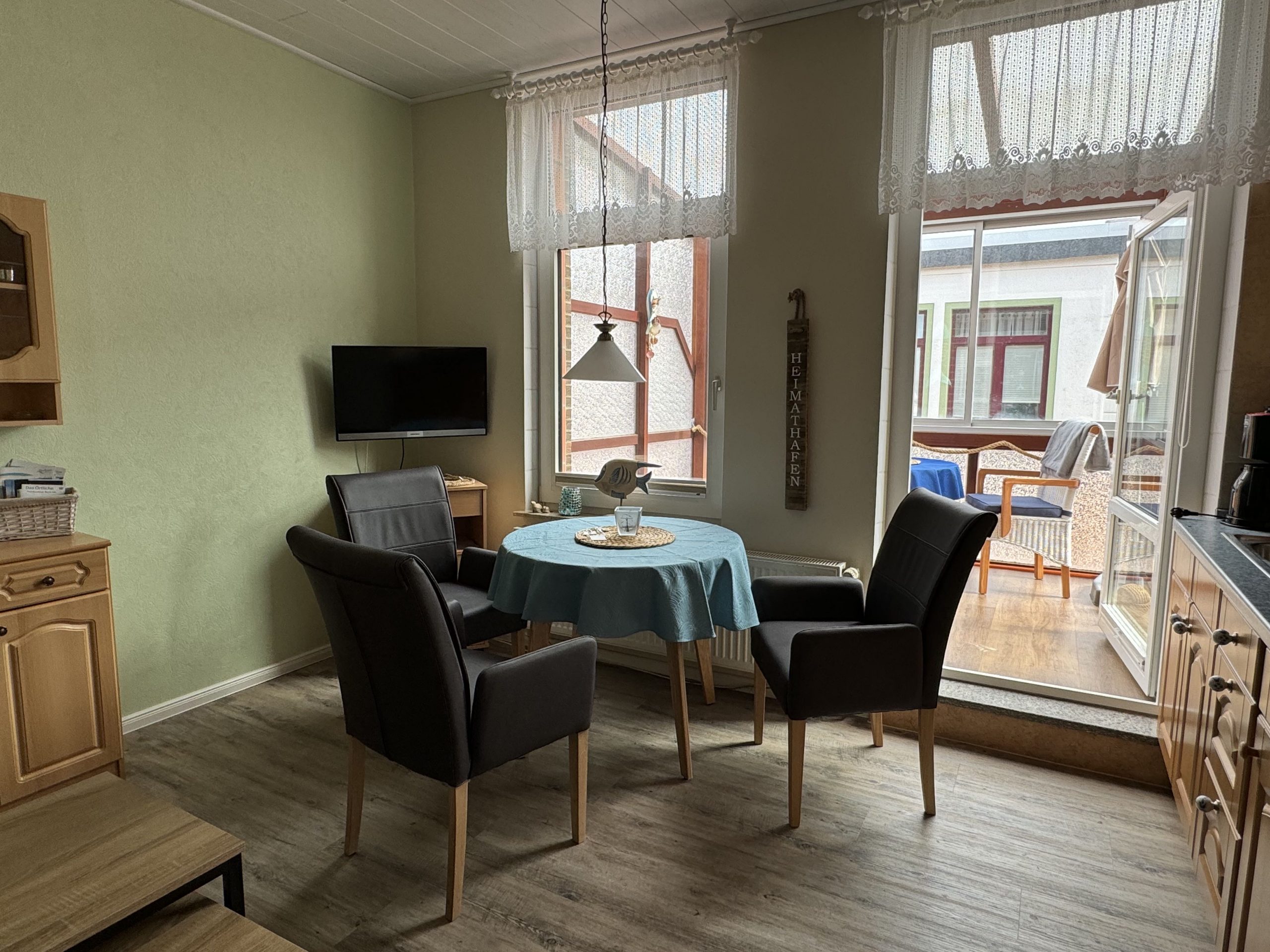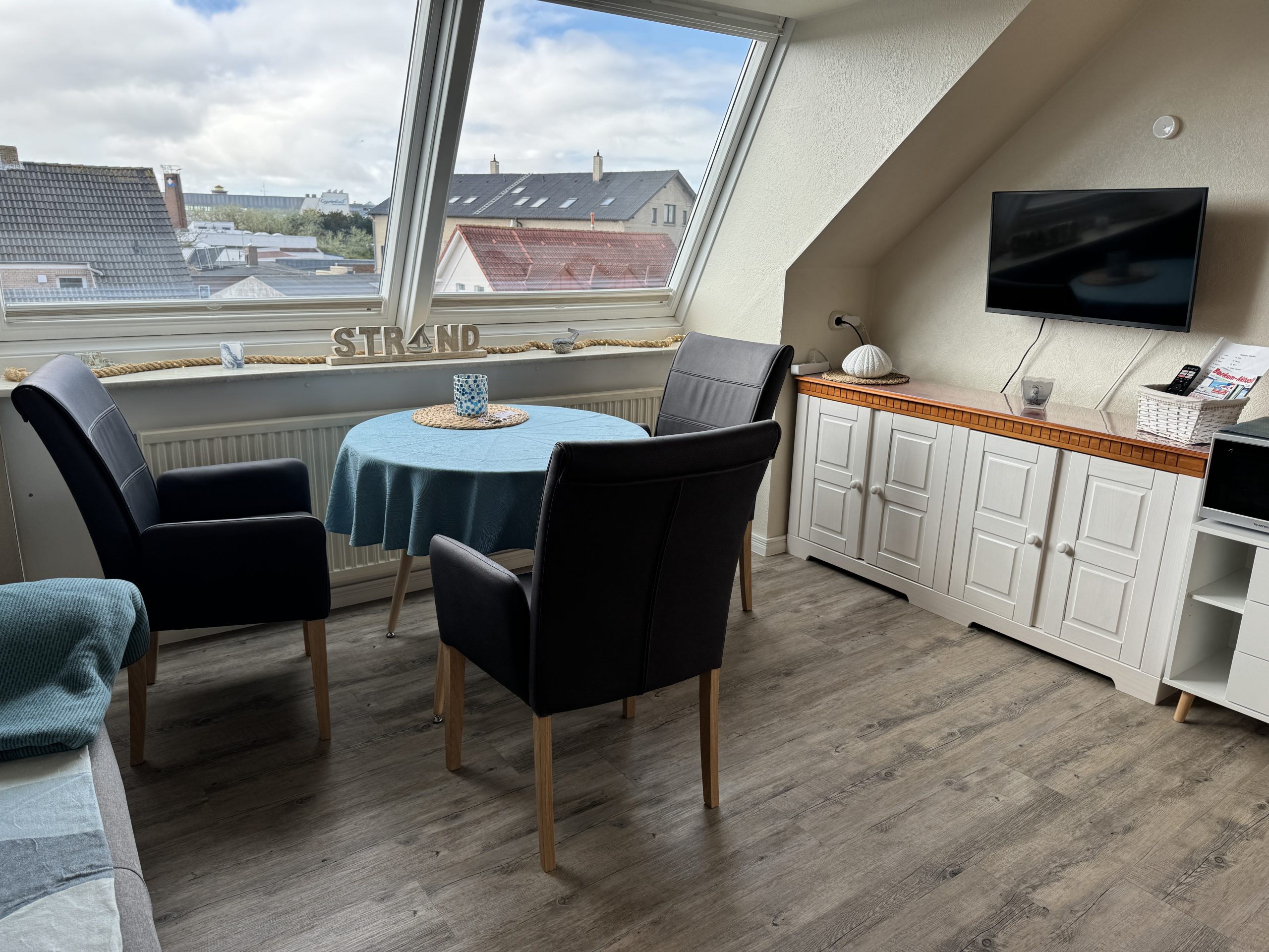 - Das Wohn-Esszimmer (14 qm) verfügt über eine gut ausgestattete Küchenzeile mit Induktionsherd, Airfryer, Kaffeemaschine, Wasserkocher, Toaster und Mixer; Sat-TV, einem runden Tisch mit bequemen Esszimmer-Stühlen sowie einem Sofa mit Schlaffunktion.
