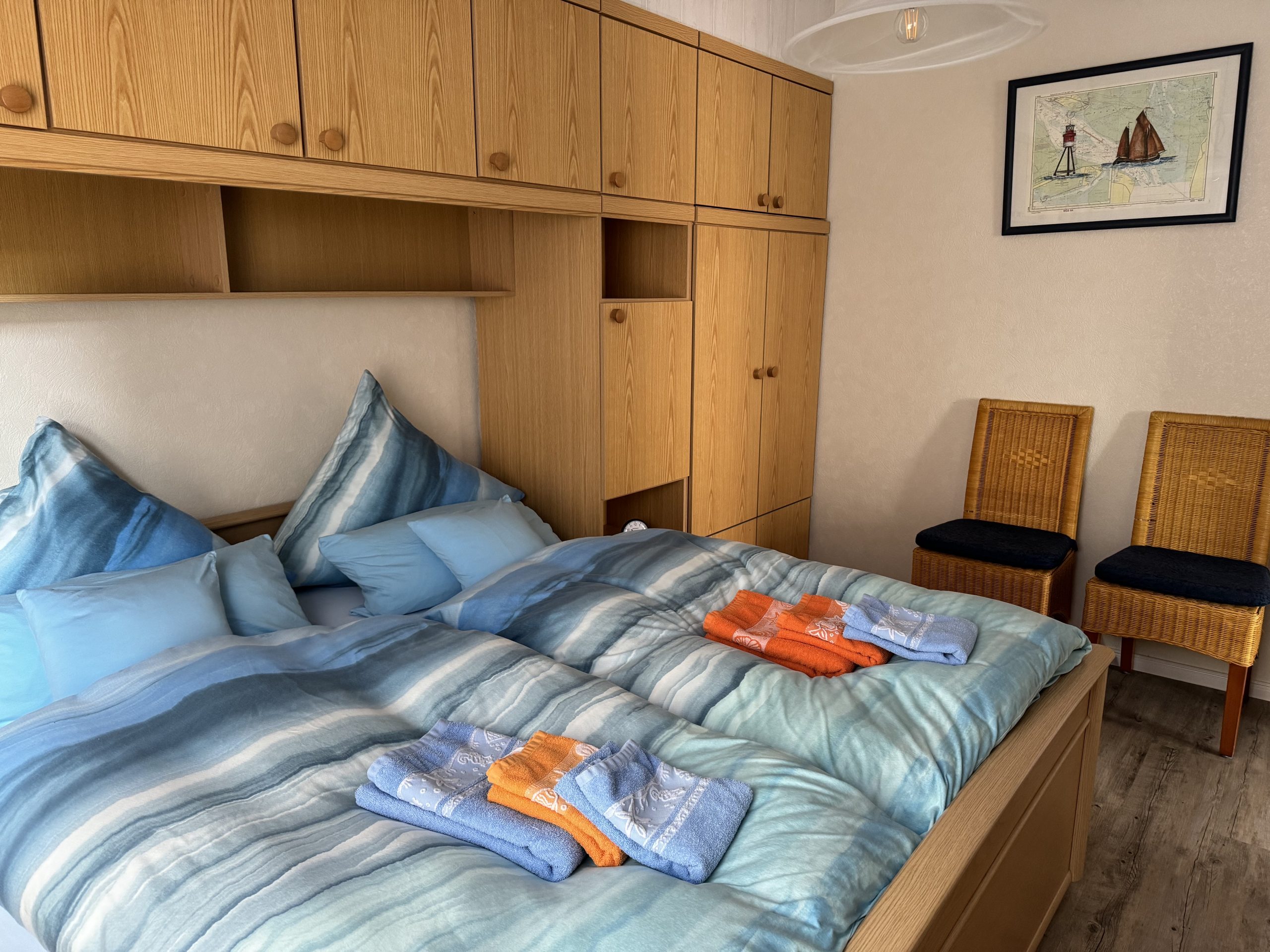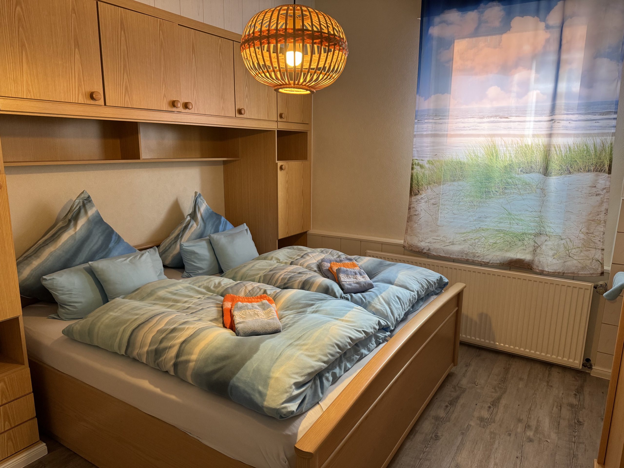 - Das Schlafzimmer (14 qm) ist mit einem Doppelbett (2 Matratzen 90 cm x 200 cm), einem Schrankbett und einem Waschbecken ausgestattet.