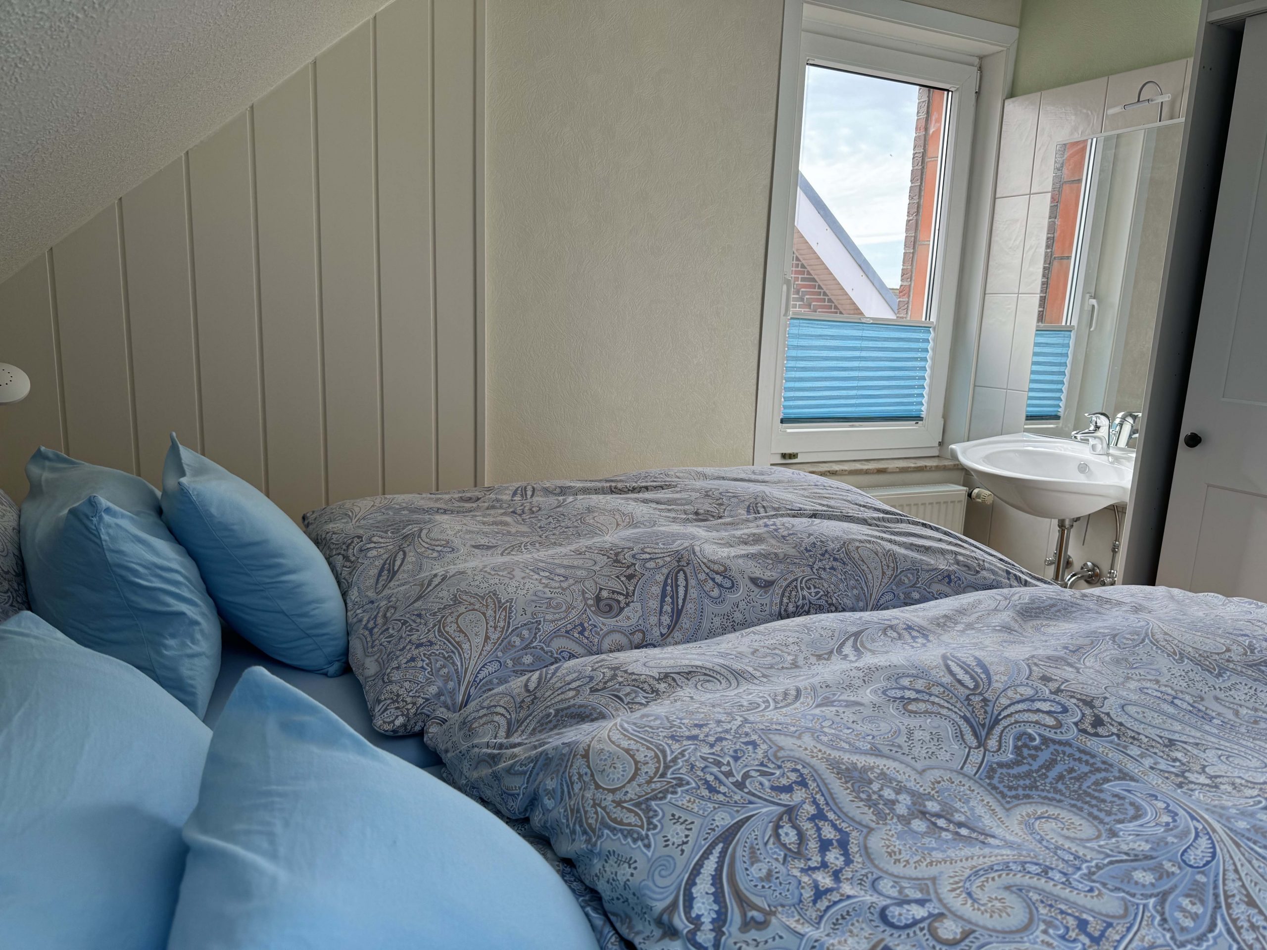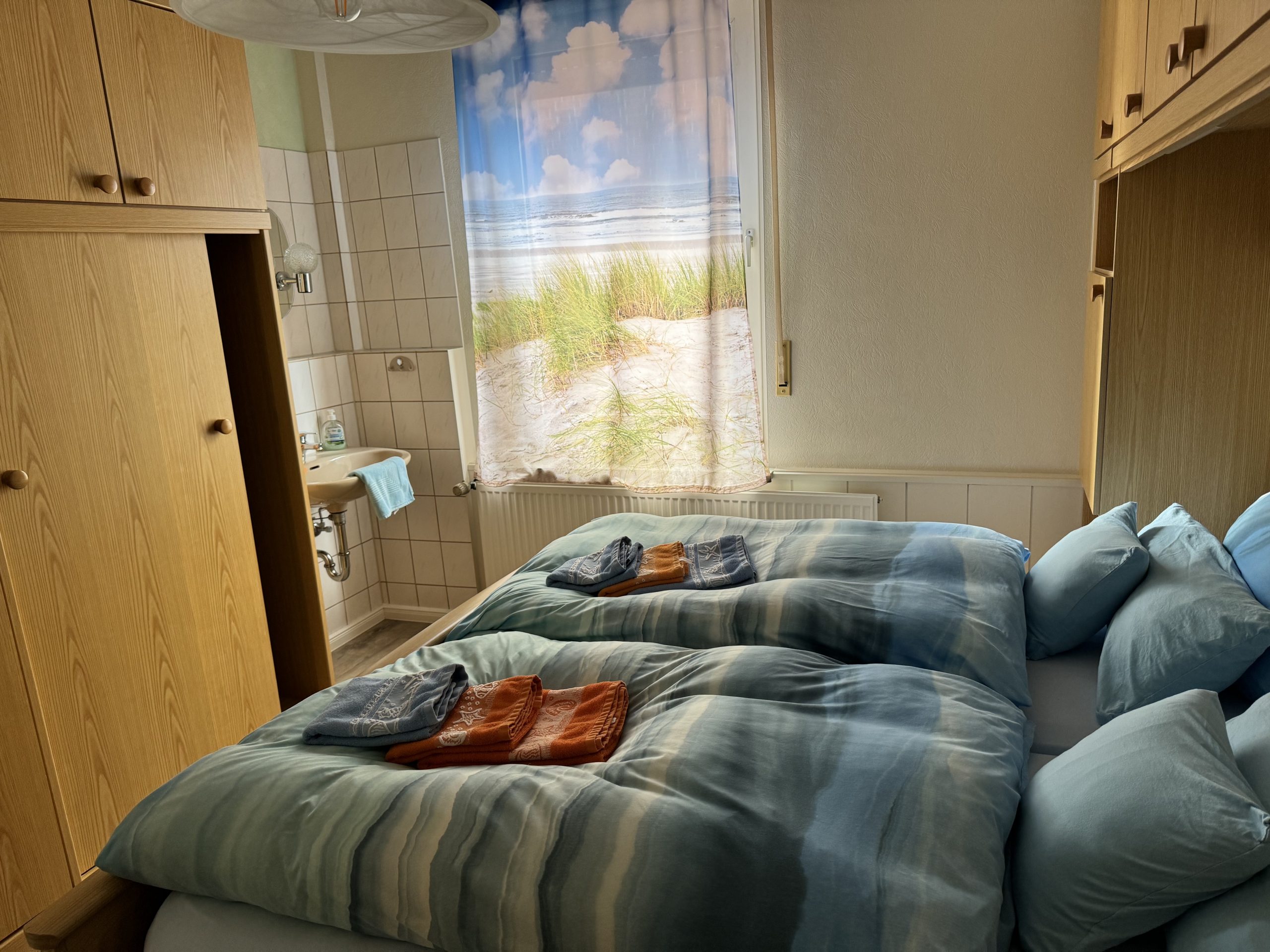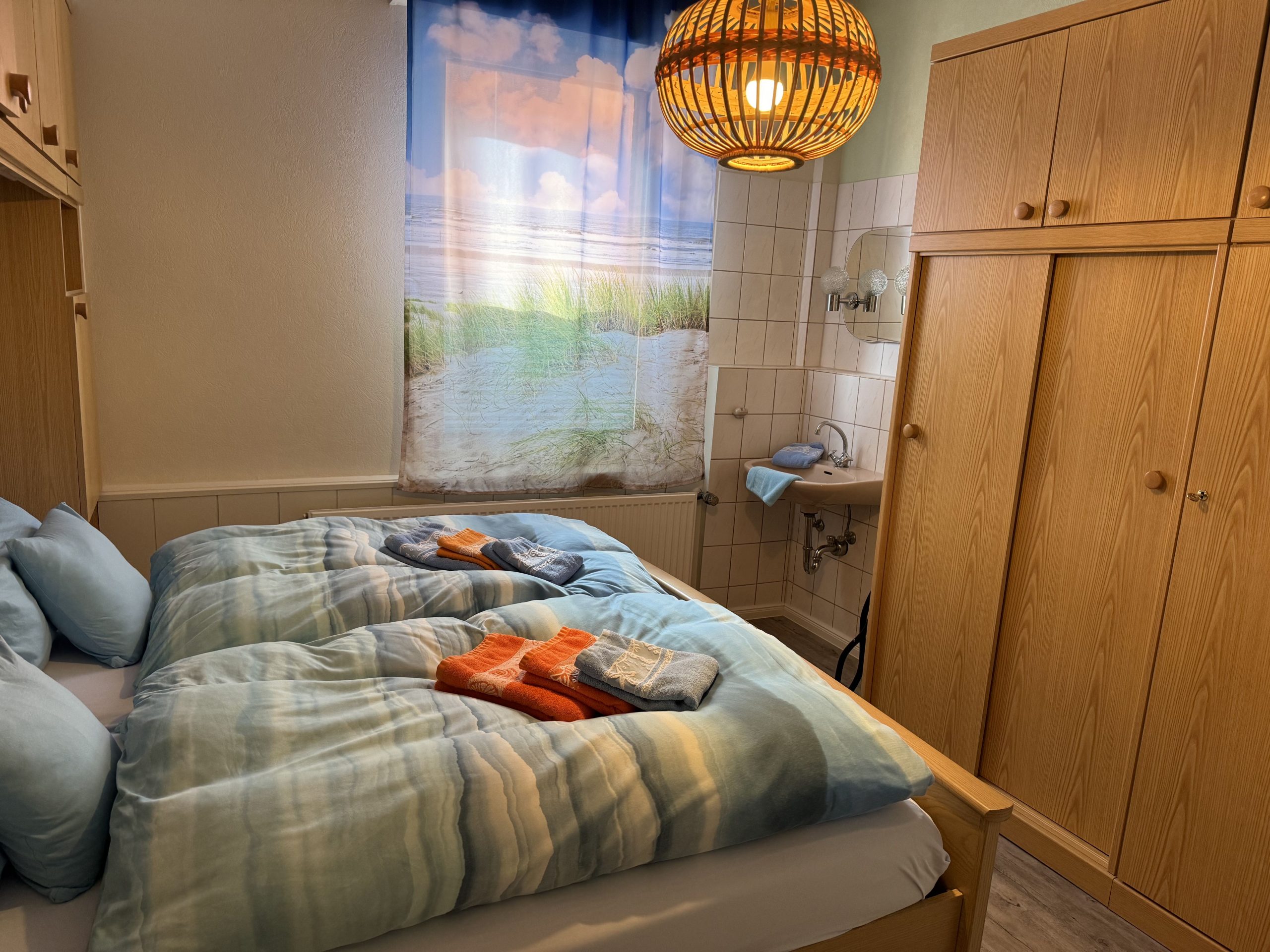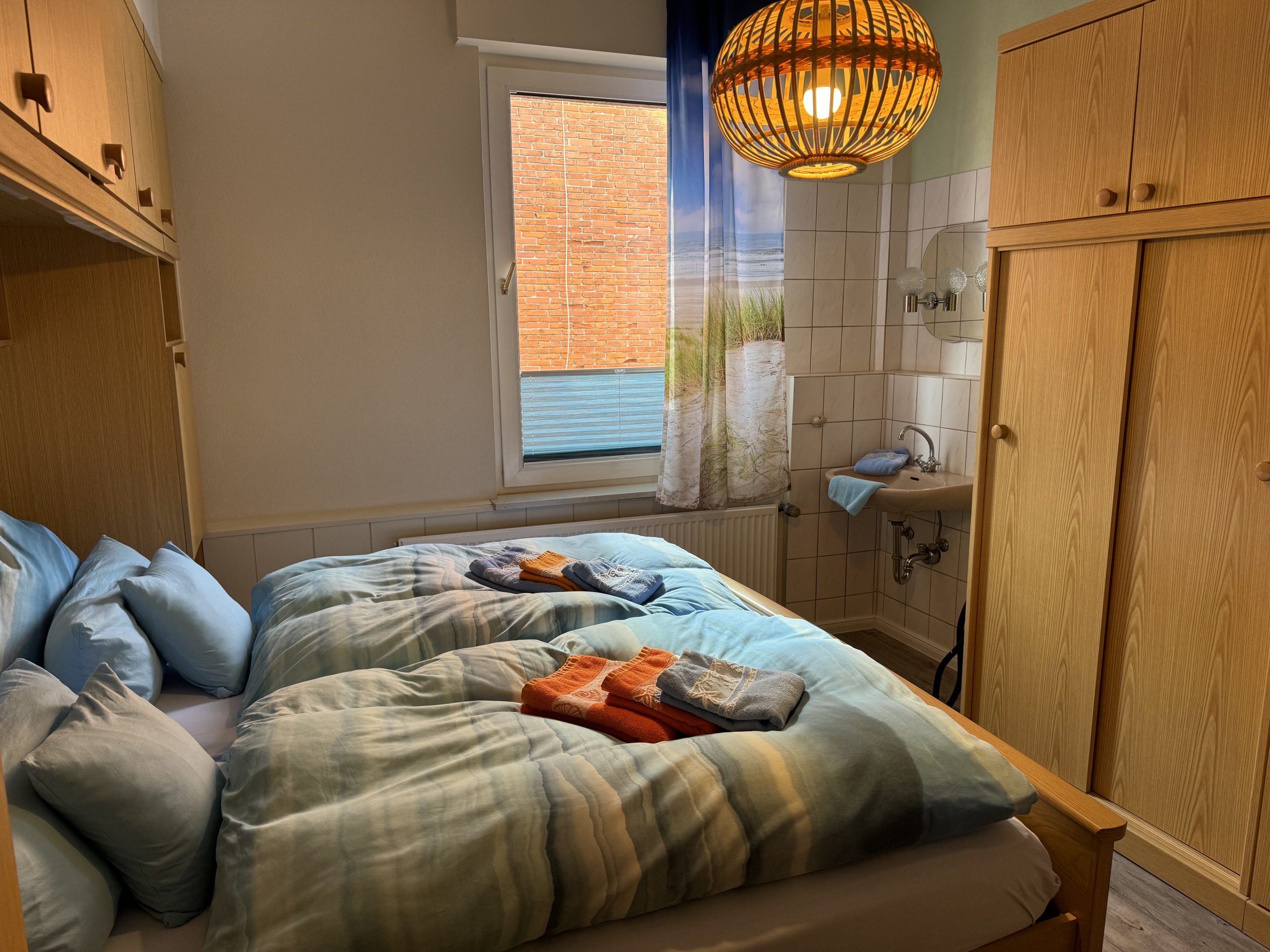 - Das Schlafzimmer (12 qm) ist mit einem Doppelbett (2 Matratzen 90 cm x 200 cm) und einem zusätzlichen Waschbecken ausgestattet.
