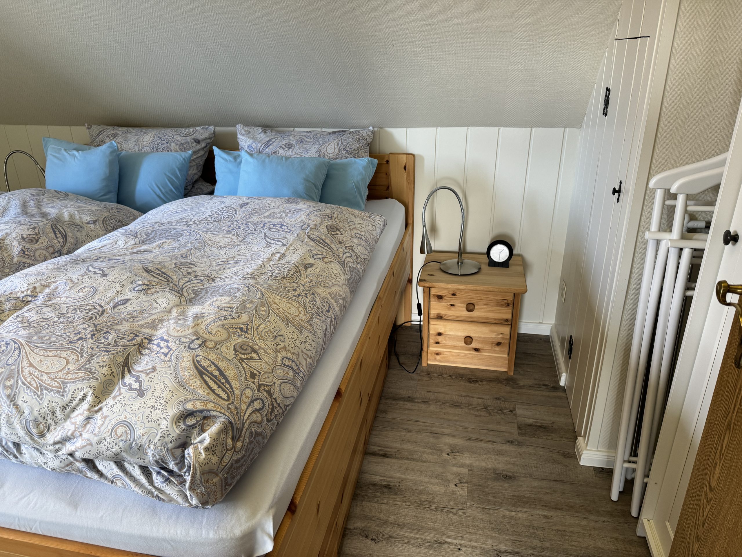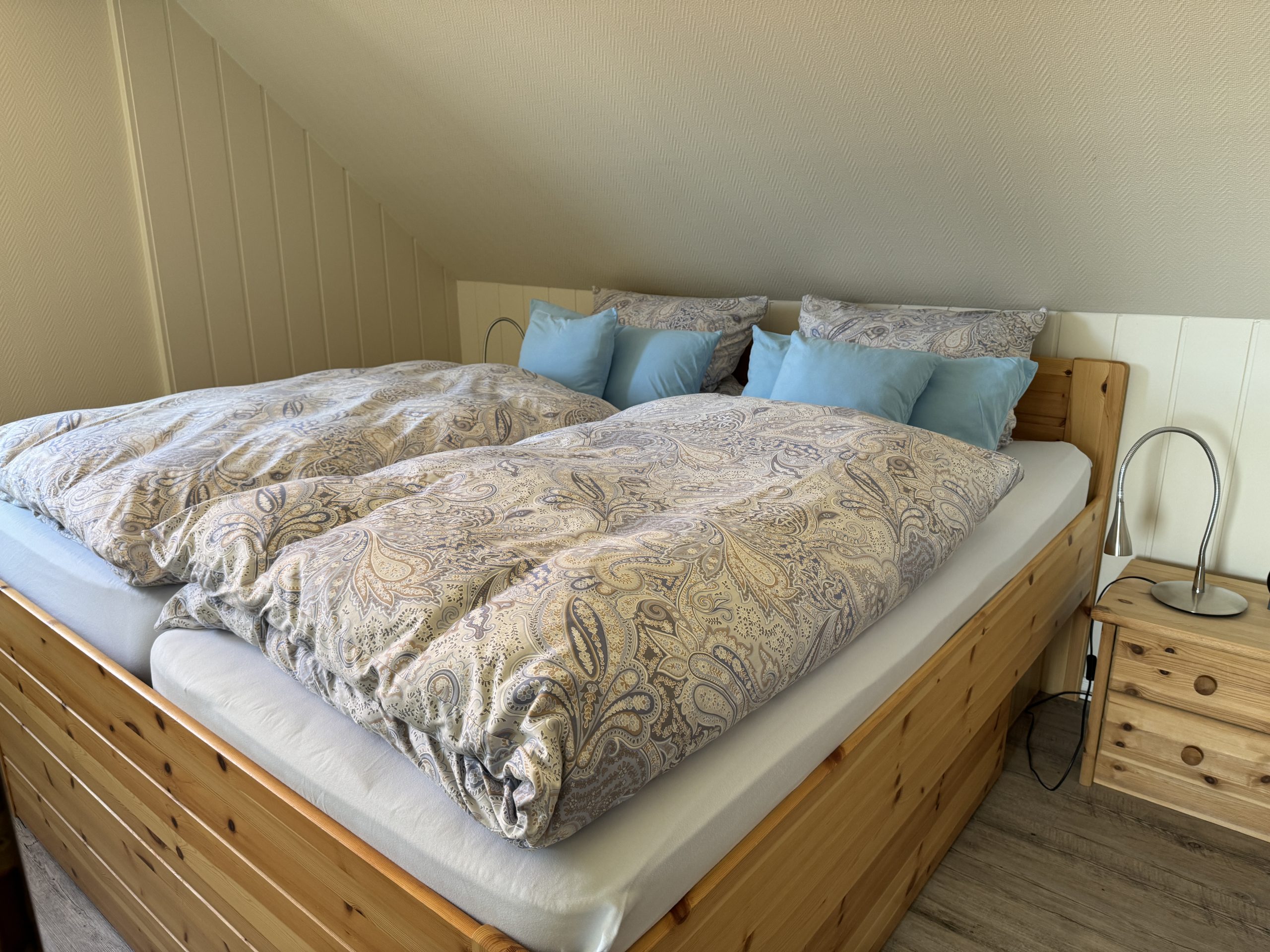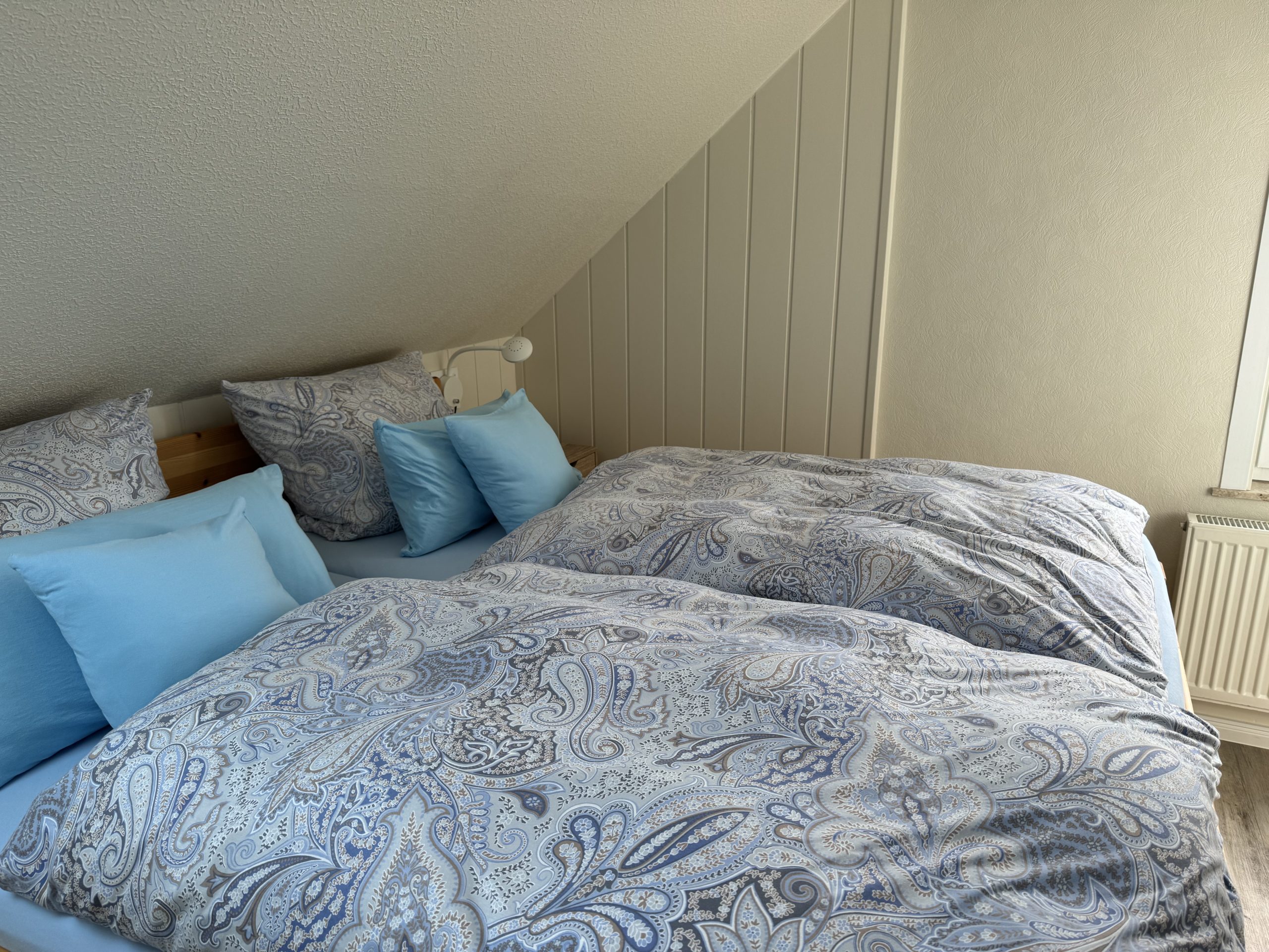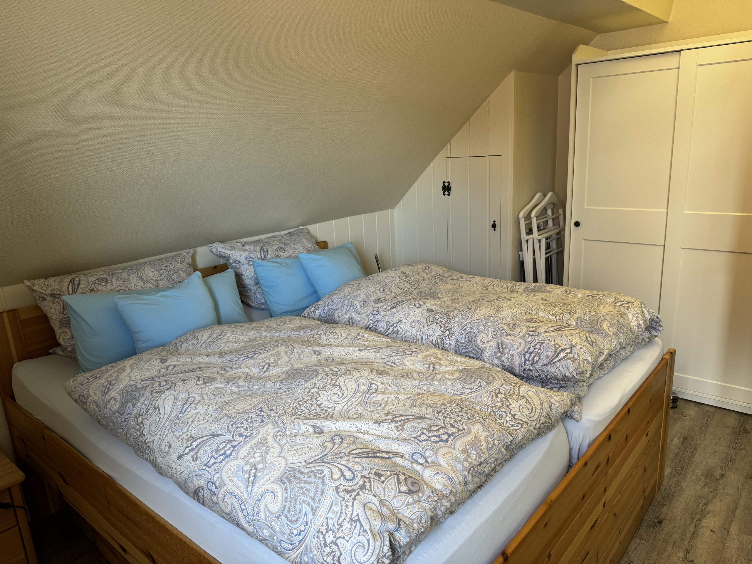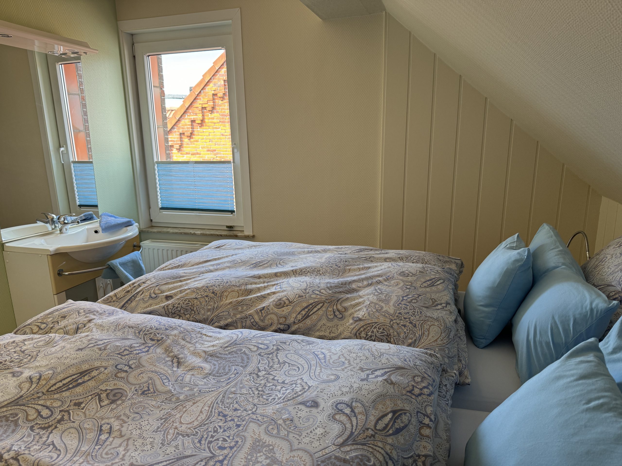 - Das Schlafzimmer (12 qm) ist mit einem Doppelbett (2 Matratzen 90 cm x 200 cm) und einem zusätzlichen Waschbecken ausgestattet.